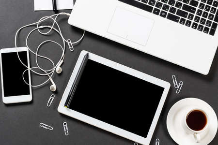 Top view of designer workplace with modern digital devices. Flat lay contemporary design with black surface. Digital technology and mobile lifestyle. Laptop, tablet computer, headphones and smartphone