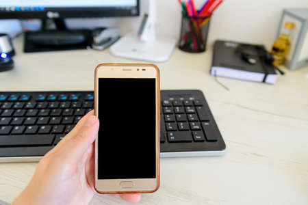 Close-up view of professional businessman looking at his smartphone while working at his workplace