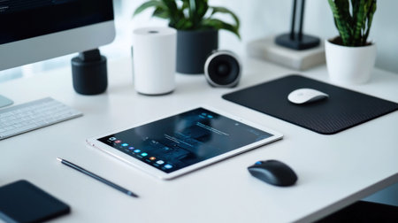 A well-organized workspace featuring a tablet, mouse, and various accessories on a clean, white desk. Perfect for technology and lifestyle themes.