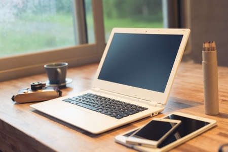 comfortable office with open blank screen laptop computer with mock up frame and office supplies with decorations