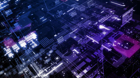 Circuit board and data network connections. Transfer digital data high-speed internet. Technology digital data in the future background concept. 3D Rendering