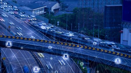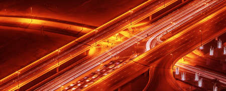 Night roads panoramic background, bird eye view on illuminated highway, modern motorway in Dubai city, UAE..