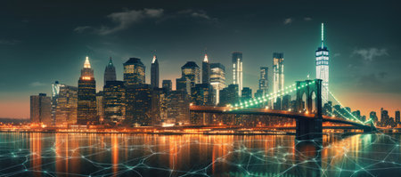 New York City panorama with Brooklyn Bridge and Manhattan skyline at night, Generative AI illustration.