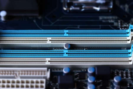 Macro Close up of computer RAM chip; random access memory chip slot for PC motherboard