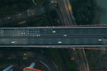 Aerial overhead shot of flyover to E'gongyan Bridge traffic before dawn in Chongqing, China