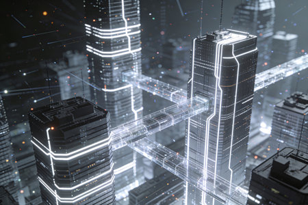 Futuristic Digital Twilight Cityscape with Illuminated Data Network Lines and Modern Infrastructure