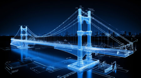 Digital architecture rendering of a bridge project, complete with blueprints and 3D model elements, representing modern infrastructure planning
