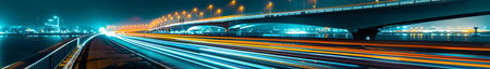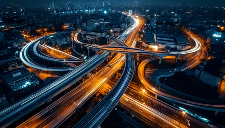 A captivating aerial view of a bustling urban cityscape showcasing a busy roadway intertwined with light trails. The scene highlights modern infrastructure and connectivity, depicting the flow of vehicles and the vibrancy of city life.