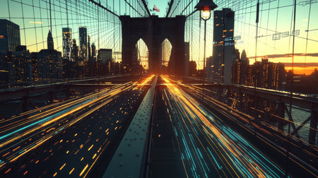 Futuristic urban bridge at sunset with dynamic light trails and digital overlays in cityscape
