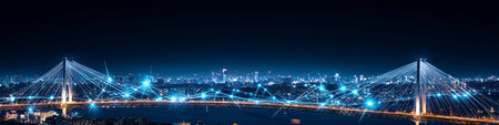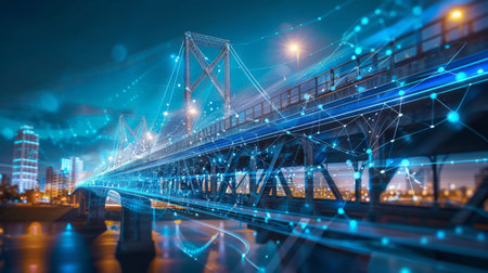 City Bridge Illuminated with Blue Lights, Connected by Digital Network, Night Cityscape