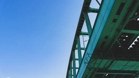 Suspension bridge. Hangers and cable of a suspension bridge isolated on turquoise background. Travel or transportation background photo.
