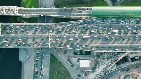 Aerial top down shot of heavy congested road traffic and moving commuter train in the rush hour.