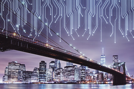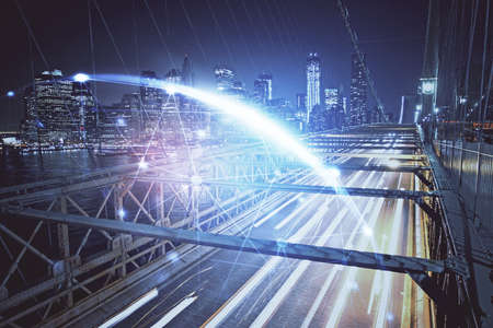 Smart city concept with glowing microcircuit lines hanging over night megapolis city bridge.