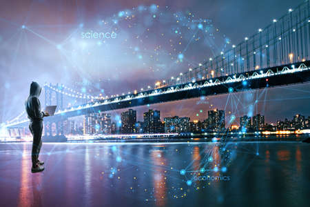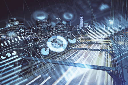 Abstract digital city background. Smart city, technology and innovation concept. double exposure