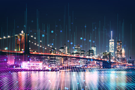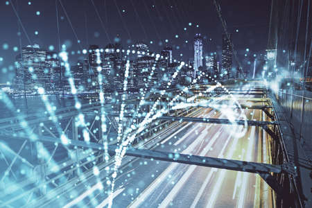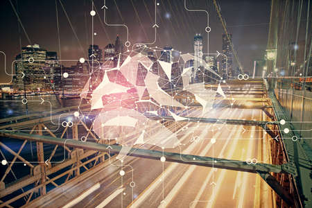Abstract night New York city background with polygonal mesh. Communication and urban network concept. Double exposure