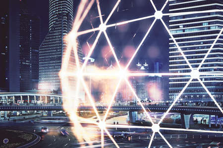 Multi exposure of social network theme drawing and cityscape background. Concept of people connecton.