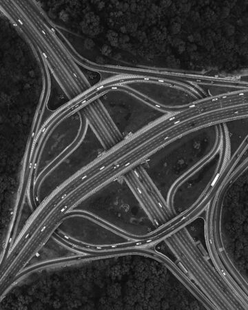 Rising drone shot reveals spectacular elevated highway, bridges, transportation