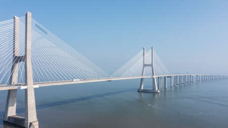 Aerial view of the most beautiful Portuguese bridge in Lisbon, Vasco da Gama. Morning foggy seascape. High quality photo