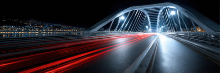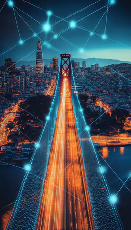 Advanced technology illuminates a bridge while vehicles move, showing connectivity and urban infrastructure.