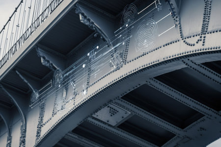 A modern suspension bridge showcases advanced engineering with digital elements under the structure.