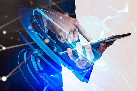 Double exposure of man's hand holding and using a digital device and brain hologram drawing. Data concept.