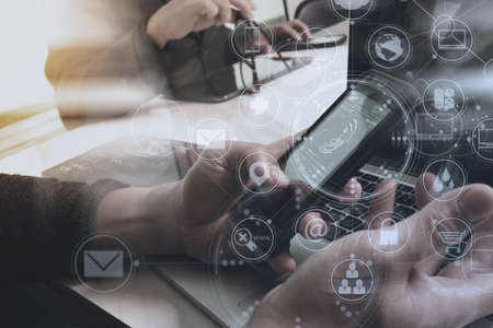 Designer Businessman hand using smart phone,mobile payments online shopping,omni channel,digital tablet docking keyboard computer in modern office on wooden desk,virtual interface icons screen