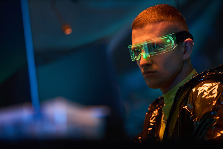 Young adult man wearing futuristic augmented reality glasses sitting at computer workstation in dark room with neon lighting