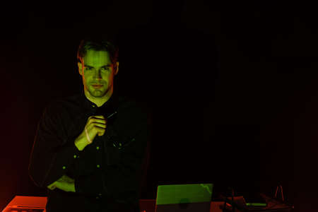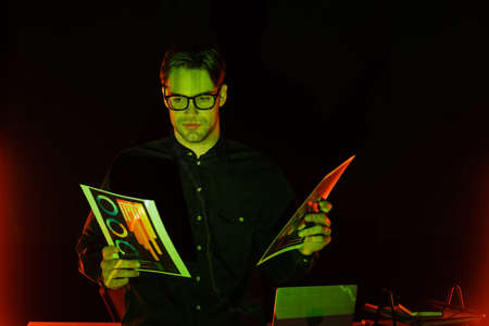 Programmer holding papers with graphs near laptop on black background with lighting