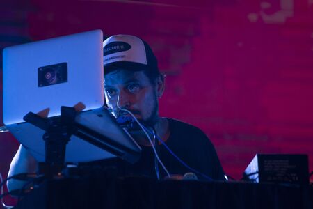 Kazan, Russia - June 28, 2019: performance of the Iranian group Infected Mushroom at the Pyramid Club. Portert of lead singer Amit Duvdevani