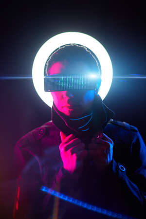 Cyberpunk style portrait of man in futuristic costume.