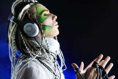 Cyberpunk style portrait of beautiful young woman in futuristic costume.