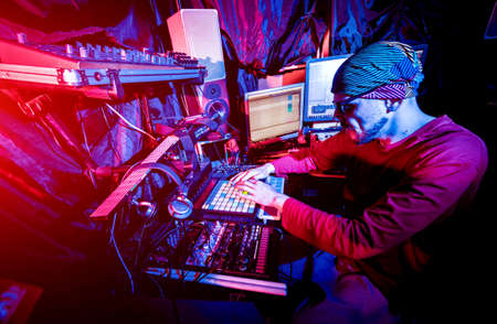 Beat machine device for electronic music composer.Techno dj play and remix musical tracks with modern drum machine.Professional sound recording studio equipment for disc jockey and producer