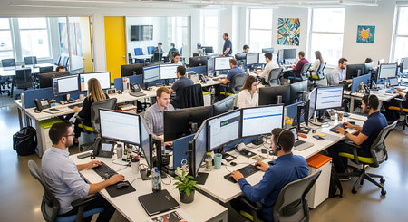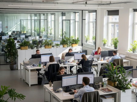 A spacious and well-lit office environment featuring multiple workstations equipped with computers and monitors. Employees are engaged in various tasks, surrounded by lush green plants that add a touch of nature to the workspace. The office has a contemporary design with large windows allowing natural light to flood in, creating a pleasant and productive atmosphere.