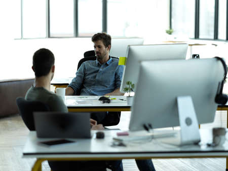 Side view of Caucasian graphic designers discussing over laptop at desk in office. This is a casual creative start-up business office for a diverse team
