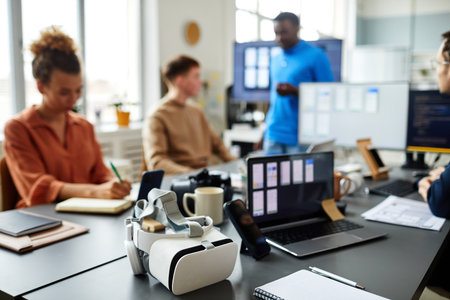 Horizontal image of VR glasses lying on table while programmers testing new software in background