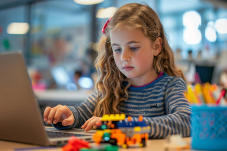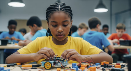 Young african american girl focused on assembling a robot kit with wires and electronic components, learning about technology and engineering in a modern classroom.
