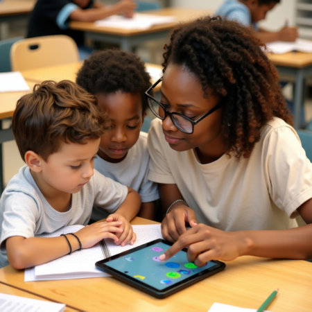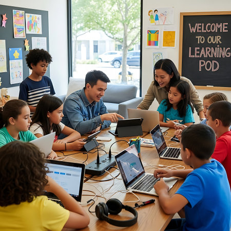 A diverse group of elementary school students and two teachers are actively engaged in a collaborative learning environment, using laptops and tablets around a large table in a bright, modern classro.