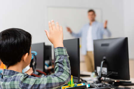 Selective focus of schoolboy with raised hand sitting near robot and computers during lesson in stem school