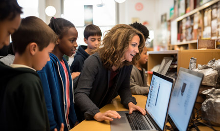 Tech Education, Teacher Guides Diverse Group of Students in a Modern, Technology Classroom.