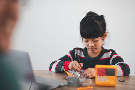 Asia students learn at home in coding robot cars and electronic board cables in STEM, STEAM, mathematics engineering science technology computer code in robotics for kids concept.