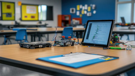 STEM classroom table setup with robotics kit, wires, tablet, and open coding workbook