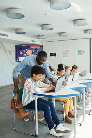 Vertical side view portrait of young boy using computer in IT class with male teacher helping him, copy space