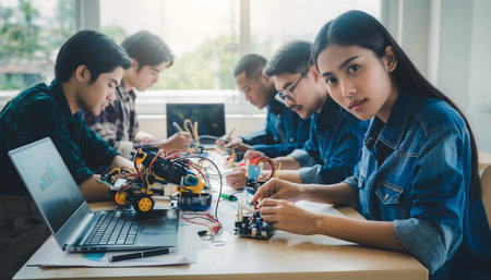 A group of students collaborating on a robotics project, assembling and programming a robot that exemplifies the hands-on learning of STEM education.