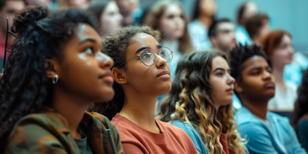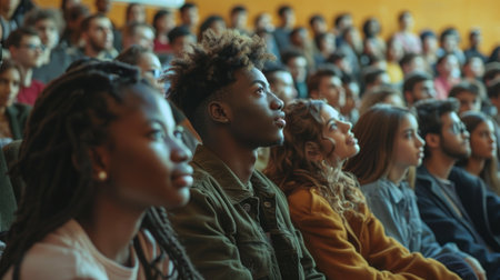 A diverse group of college students engaged in a lecture in a university classroom. Concept Education, College Life, Classroom Environment, Diversity, Student Engagement