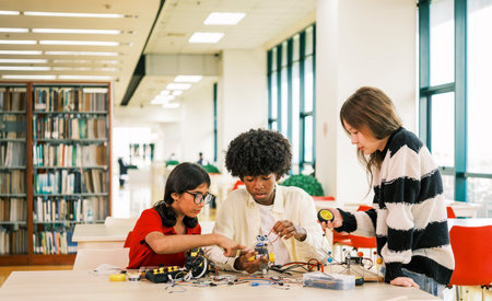 Group of students building and programming electric toys and robots at robotics classroom