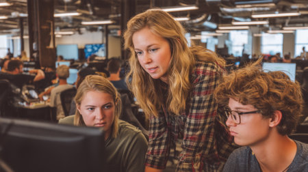 Collaborative workspace with three individuals engaged in discussion about computer screen. atmosphere is focused and dynamic, showcasing teamwork and problem solving in modern office environment