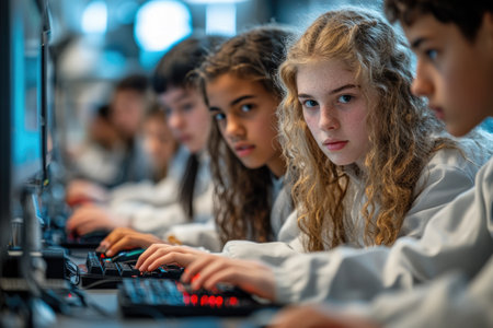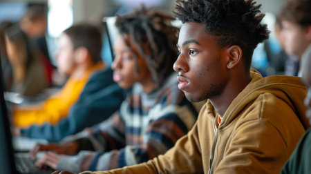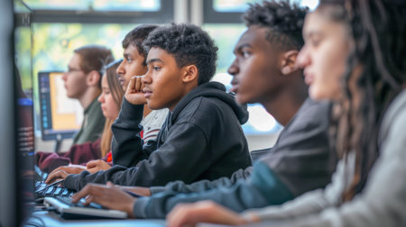 Focused students work on computers in a technology class, coding and developing software as part of their education. AIG41