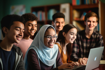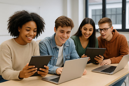 Eager Faces Illuminated: Joyful Students Engrossed in Classroom Laptop – AR 3:2
