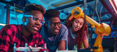 Students and teacher collaborating and learning on a robotic arm in a classroom. Encouraging innovation teamwork and creativity in educational activities. Robot hand. Innovation and technology concept