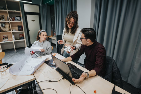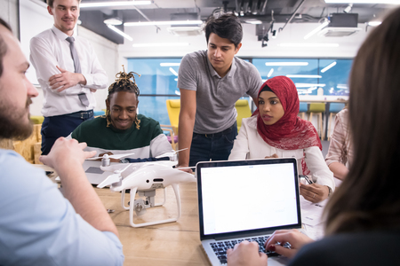 Multiethnic startup business team discussing new business plan, working on laptop and tablet computer while learning about drone technology for new business advancement